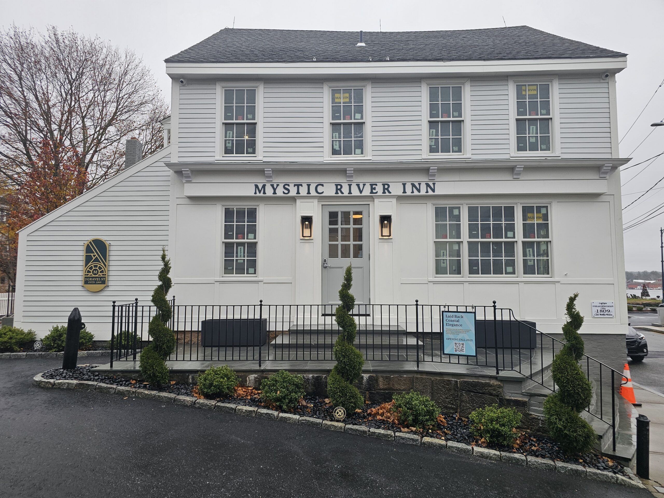 The result is the Mystic River Inn, a seven-suite property. Each suite follows a consistent layout with one bedroom and one bathroom, finished with marble baths, wood floors, and Kohler fixtures. All include flat-screen televisions, in-room coffee stations, complimentary Wi-Fi, and on-site parking. Housekeeping services are available as needed.